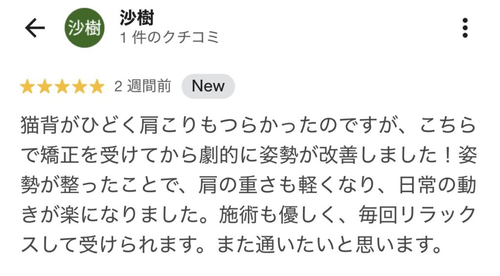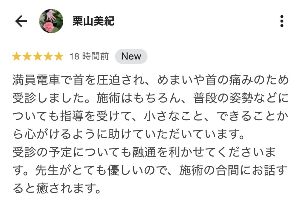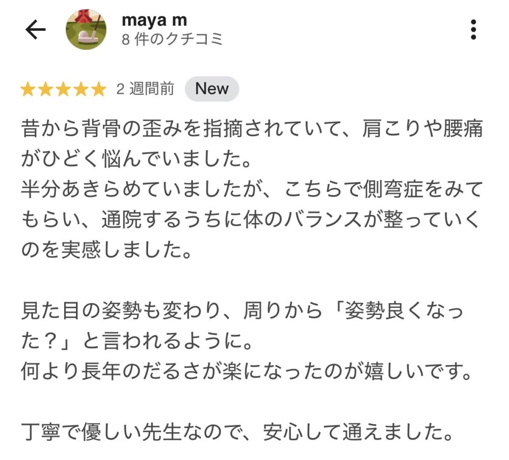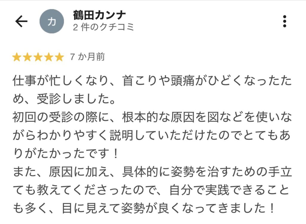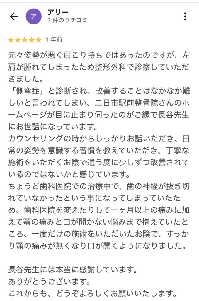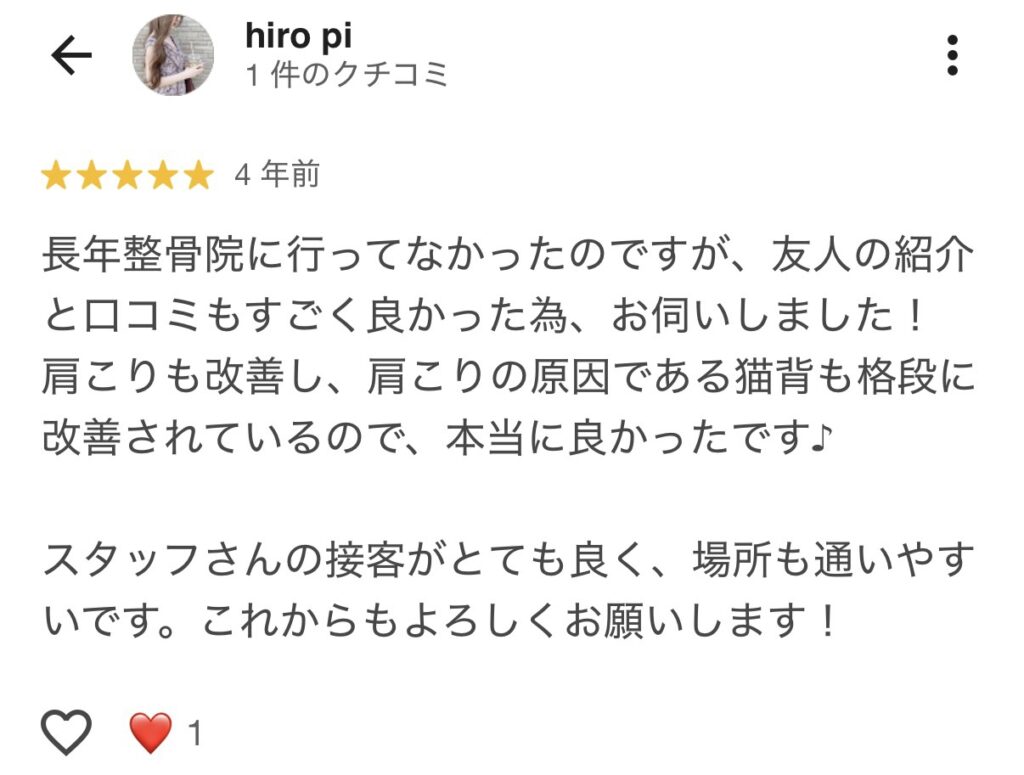 今までのわたしの症状だったら考えられなかったので本当に良い整骨院を見つけたと思います。