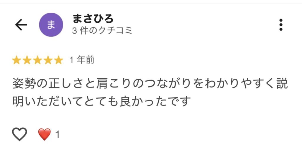 私の体にあった施術内容とストレッチを教えていただいたおかげで、自分自身でもなぜ肩こりが起きるのか、どうようにすれば改善することができるのかがわかりました。