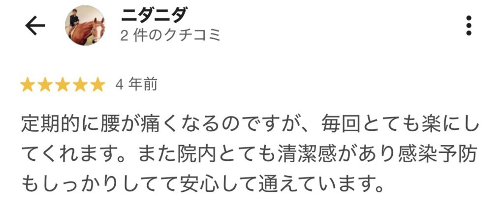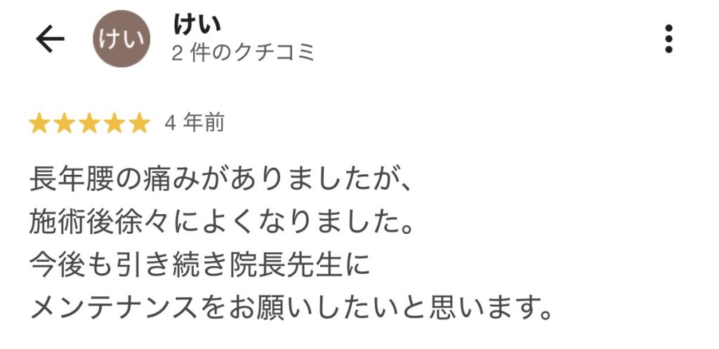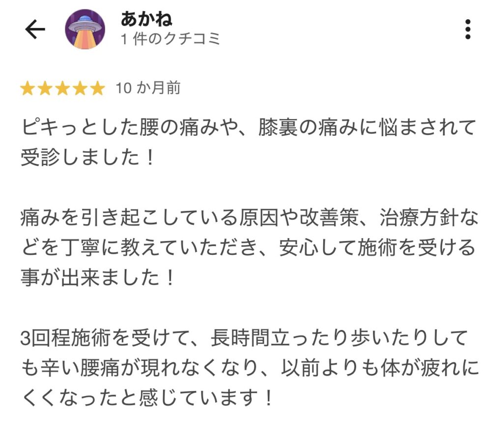 先生は次の施術でひねる痛みは取れますよ。と言ってくださり、実際に2回目の施術後に痛みが消えました。