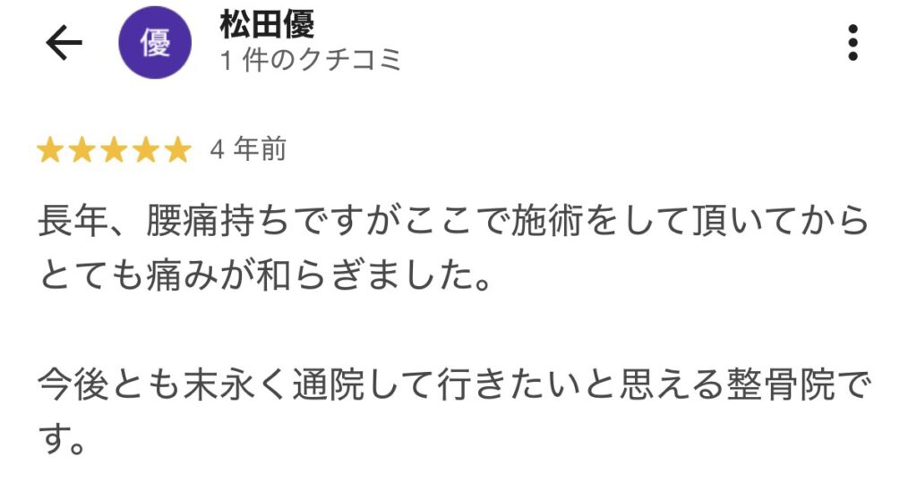 今では昔の腰痛が嘘のように取れていて楽に過ごせています。私のように腰痛に悩まれている方がいればおすすめしたいと思います。