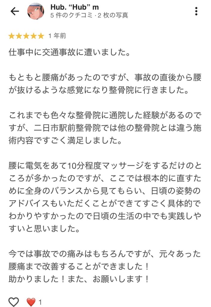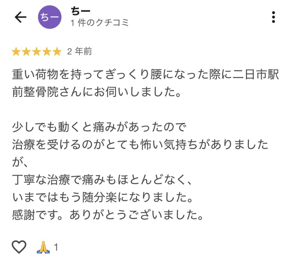 痛みは少し軽減しましたが、改善しているという気持ちにはならず、自分は一生このまま腰痛と付き合わないといけないと諦めかけていたときに、二日市駅前整骨院さんのホームページを見つけました。