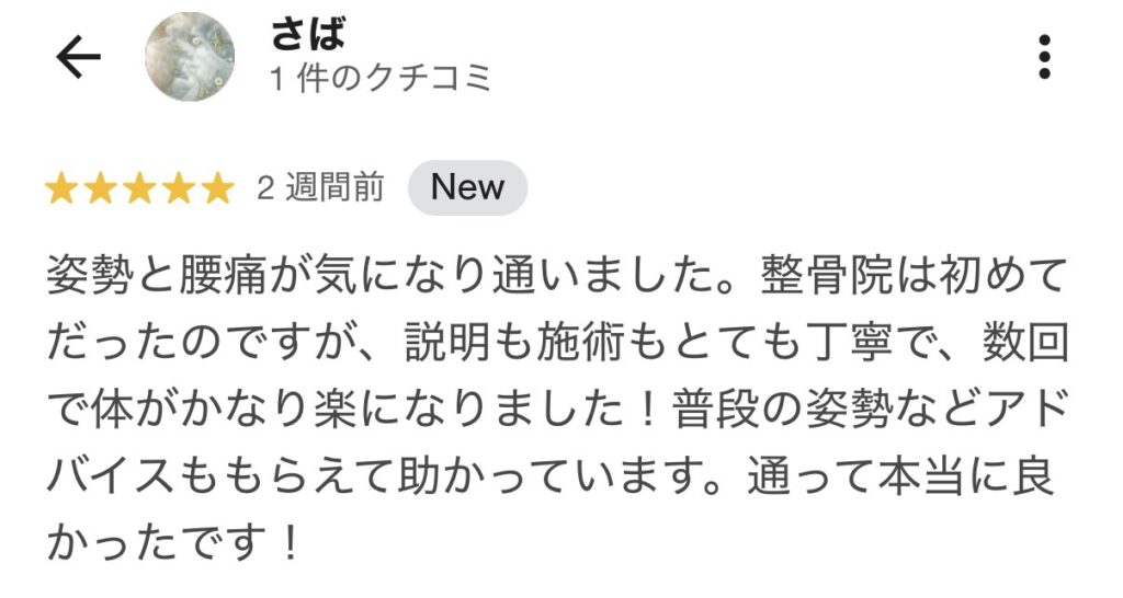 院長の長谷先生に担当していただいたのですが、とても親身に私の悩みを聞いてくださいました。半分腰痛を改善することを諦めていた私ですが「ここなら改善できるかもしれない」と言う気持ちにさせてくれました。